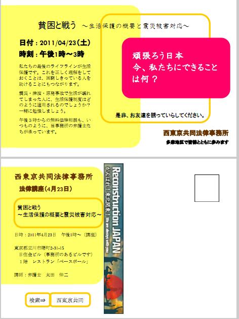 震災・津波・原発事故の関係で、そこを離れざるを得なくなった人は、形の上では処分可能な財産があったりしますので、杓子定規に生活保護の規定を適用すると、「不可」になるんですが、お役所の通達が今回は早かった。弾力的な運用を相当に心がけているように思えます。