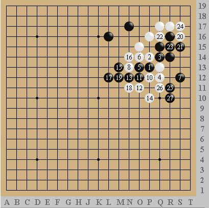 こんにちは。 定石は苦手で知らないのですが、こんな感じでしょうか? 黒9はP11です。 この図のあと、黒はP18とQ10が見合いで、黒良しという感じに見えますが。