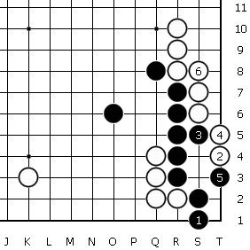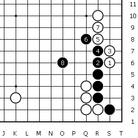 図の10までが想定される手順ですが、出来上がった形を見ると上辺の白△が生きている石からせまく一間にヒラいた格好になっており、白に不満があります。