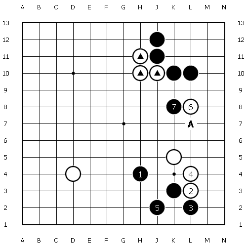 黒7までとなれば白は右辺と△の三子とが引き裂かれた形になるので、黒が打ちやすい碁ではないか。