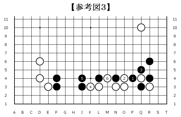 【参考図3】 参考図2の黒3を本図の黒1とするなら、白6までのワカレになるだろうか? このワカレは互角かもしれない。