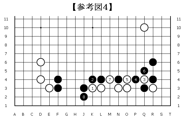 黒は8と補強するくらいとすると、参考図3と違って白が先手のワカレになる。